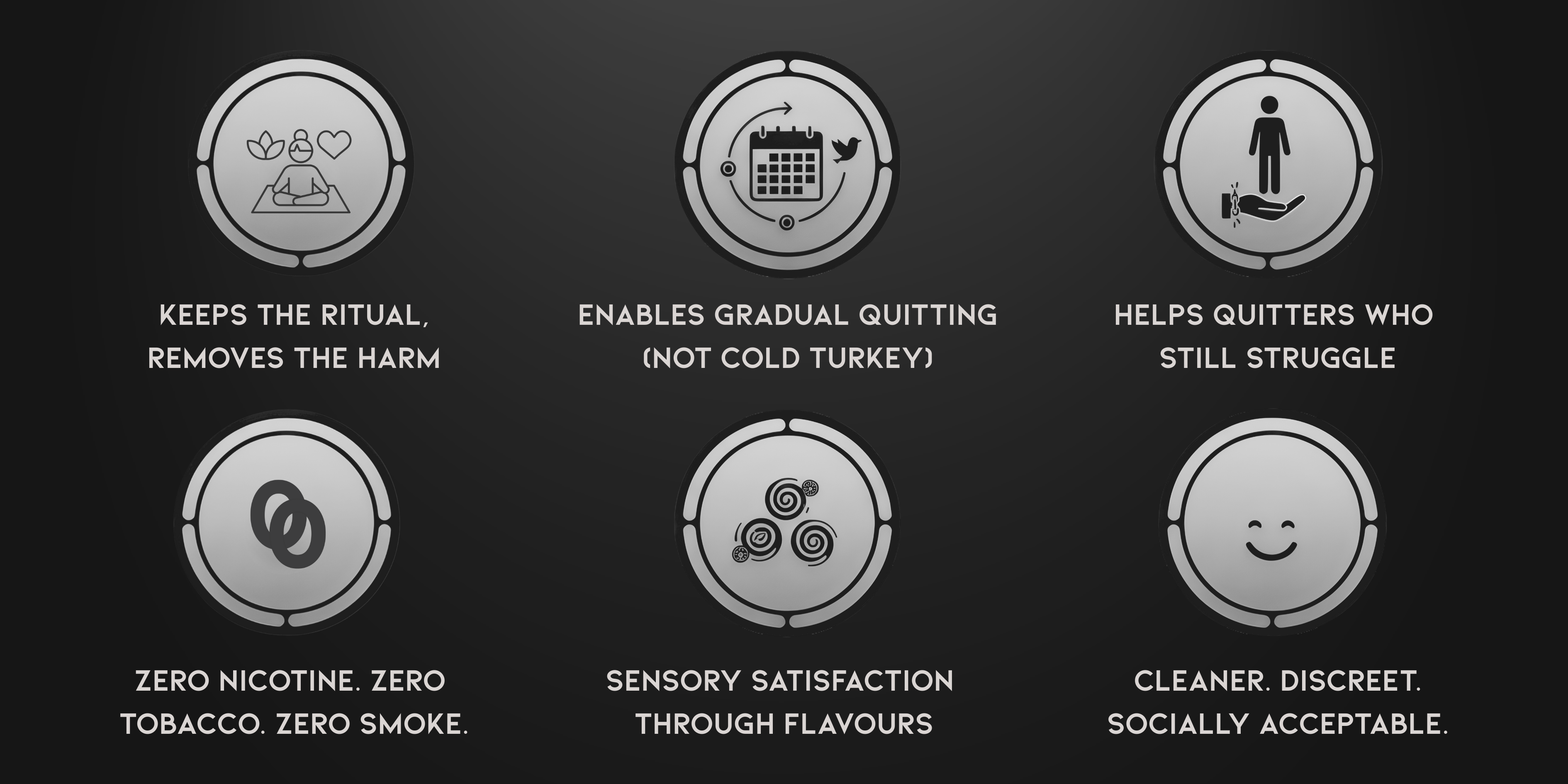 It keeps the familiar hand-to-mouth motion, inhale, and exhale, but replaces smoke and toxins with clean, flavourful air.